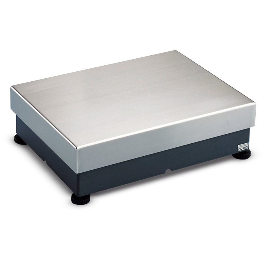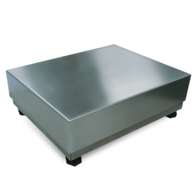 Balança industrial com base retangular em aço inox e pés reguláveis na cor preta.
