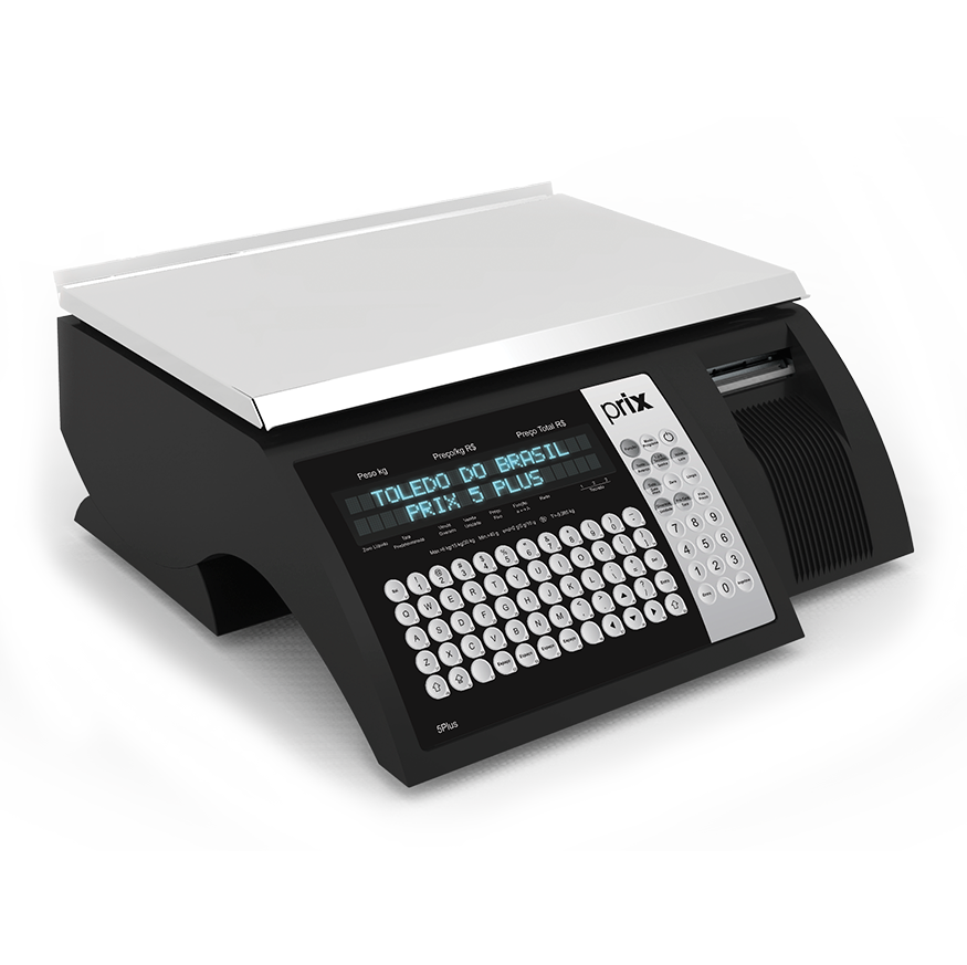 Balança Prix 5 W Plus feita de aço carbono na cor preta e prato em aço inox, teclado alfanumérico e saída de etiquetas frontal.