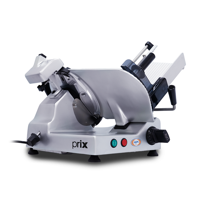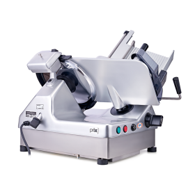 Prix Mezzo 300S é um fatiador de frios em alumínio e aço inox, manopla de controle e botão de energia lateral e vista frontal
