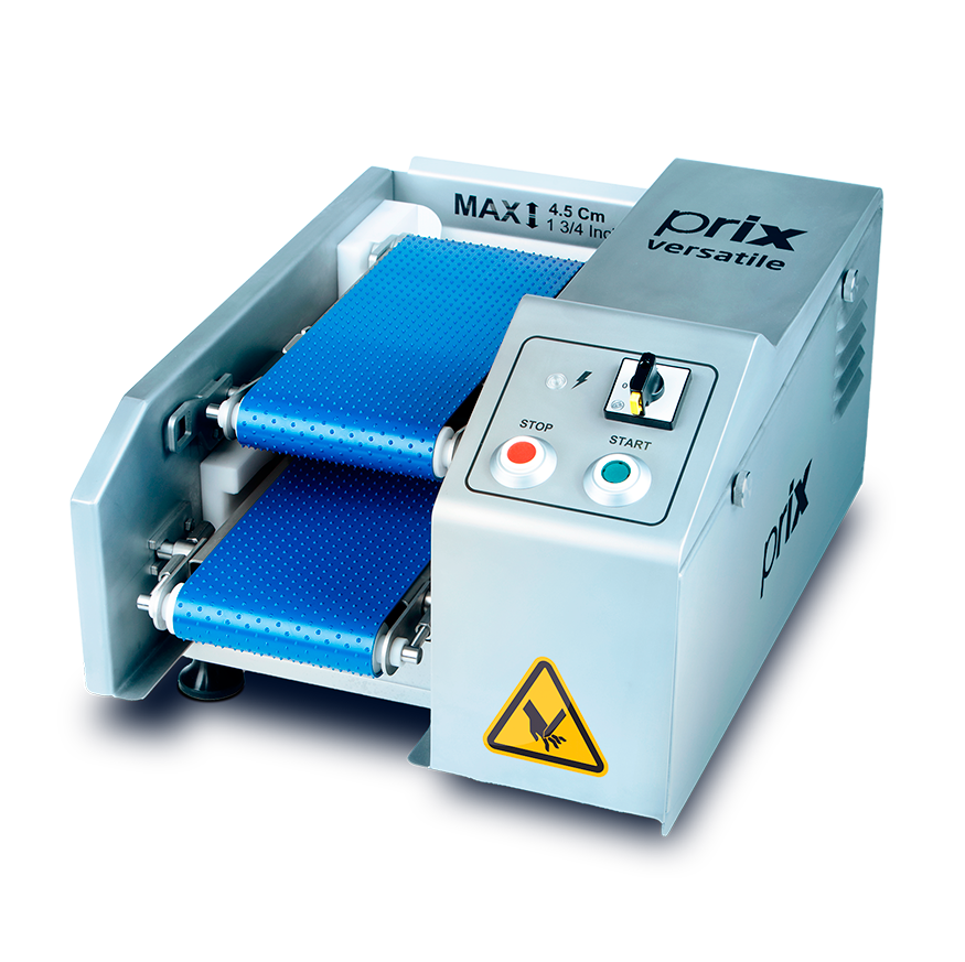 Prix Versatile, estrutura em aço inoxidável, duas esteira rolantes na cor azul, kit de lâminas removíveis e botões de stop e start